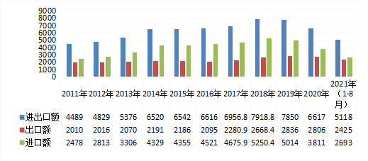 图1:2011-2021年我国服务贸易进出口额统计(亿美元)