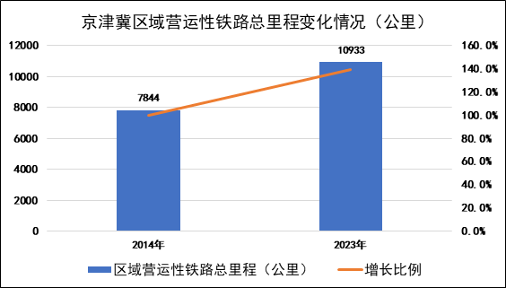 一是城市轨道交通有序落地,大大提高三地通达效率。京广高铁、京沪高铁、京雄城际铁路、京港台高铁、京昆高铁、津兴城际铁路等6条轨道交通陆续开通,京张高铁配套清河火车站、北京朝阳站、丰台站改造等铁路枢纽工程完工,截至2023年底,京津冀三省市区域营运性铁路总里程达10933公里,较2014年增长38.3%,高速铁路总里程增值2576公里,基本实现京津雄核心区半小时通达、中心城区到毗邻城市时间缩短至1小时、主要枢纽到津冀主要城市时间缩短至2小时,以北京、天津为核心枢纽,贯通连接河北各地市的全国性铁路网已基本形成。