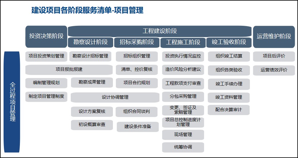 一是更多站在甲方角度与高度,统筹项目建设全过程,从管理范围层面尽量覆盖项目建设过程涉及的各方面,突破传统概念,如进度、投资、质量、安全、商务等项目工程管理范畴,从而向更深层次的甲方需求进行拓展和支撑,如项目策划谋划、融资、需求分析、运营模式分析等。