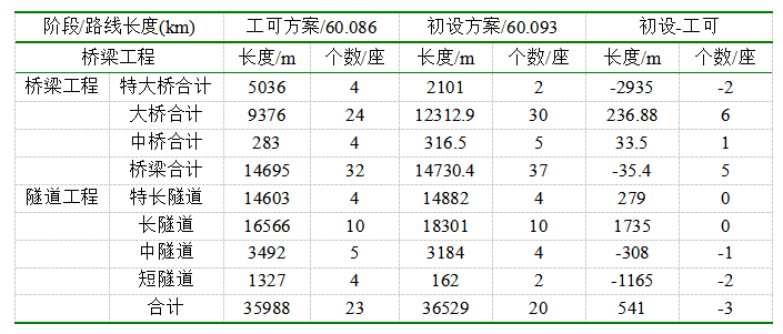本工程工可方案路线全长60.086km,初设增加7m,构造物设置工可设置桥梁14695m/32座,初设方案桥梁14730.4m,设置37座,较工可增加5座桥梁,减少35.4m;工可阶段隧道全长35988m,共23座,初设优化方案后隧道全长36529m,共20座,较工可减少3座,增加554m。