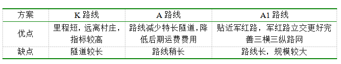K路线于陈家台跨域大石河,布设于大石河南岸,依次布设于佛子庄乡政府、二道沟、刘家台等附近。A路线于佛子庄乡与K线基本一致,进入南窖乡范围内,路线布设向大西沟区敷设,利用地形减少特长隧道规模。A1路线班陈路避让军事用地段落与方案一保持一致,黑龙关附近路线向北布设。此路线不经过南窖乡。中间段结合基本农田以及对地方交通服务功能综合分析,推荐A线。具体见表2所示。