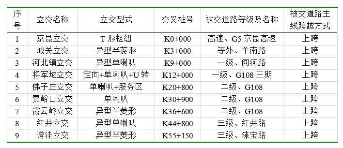 经综合比选,推荐K线方案,根据本项目路线的总体布局、公路网现状和规划、沿线自然地理地形条件以及全线互通布置的均衡性等因素,结合108新线高速公路具有“平急两用”功能的道路,为了更好的服务沿线村镇,提供应急通道,沿线设置了9处立交节点,作为应急保障的重要通道同时带动沿线区域经济社会发展。全线共设置互通立交9座(野三坡立交位于河北段),其中枢纽互通2座,服务型互通7座,平均间距约6公里。