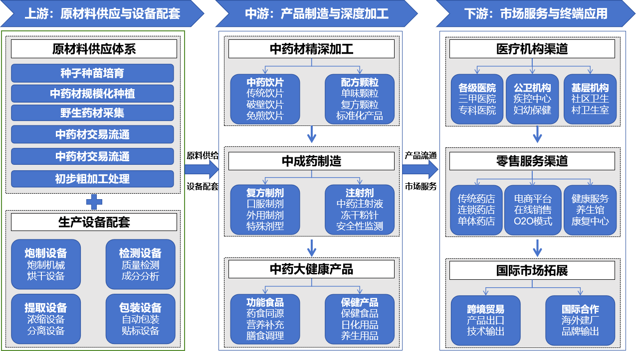 依据《中华人民共和国中医药法》及有关国家标准,中医药产业是以中医药理论为指导,运用传统和现代技术方法,从事中药材种植养殖、生产加工、流通使用等相关经济活动的产业体系。上游包括原材料供应和生产设备配套,涵盖种子培育、规模化种植、设备制造等环节;中游承担产品制造与深度加工,从中药饮片到配方颗粒再到中成药的全产品线生产;下游构建多元化市场服务体系,通过医疗机构、零售渠道和国际贸易实现产品价值。