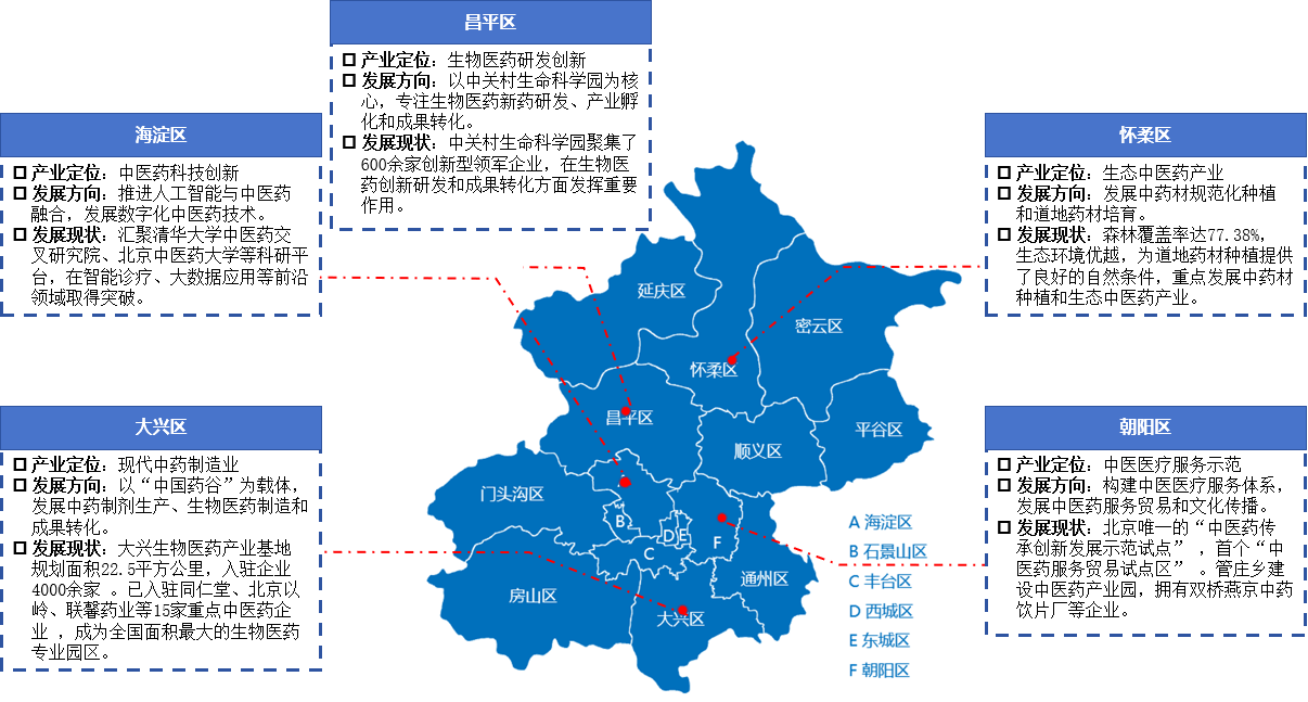 在产业空间布局方面,北京形成“五区协同、错位发展”的产业布局。大兴区作为现代中药制造业核心区,占全市中药产值的43%,聚集同仁堂集团、天士力控股等15家核心企业[5]。朝阳区专注医疗服务体系,建成260多家中医机构[6]。海淀区依托中关村优势,聚集中医类医疗机构188家。昌平区生命科学园集聚120家相关企业。怀柔区发挥生态优势,重点发展中药材种植产业[7]。