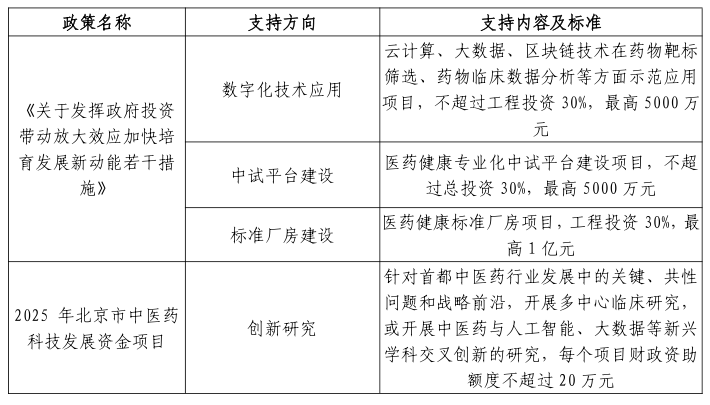 北京市构建了覆盖中医药产业多层次资金支持体系,形成了市级统筹引导、区级特色支持的政策格局,为中医药企业发展提供精准化资金保障,支持内容及标准详见下表: