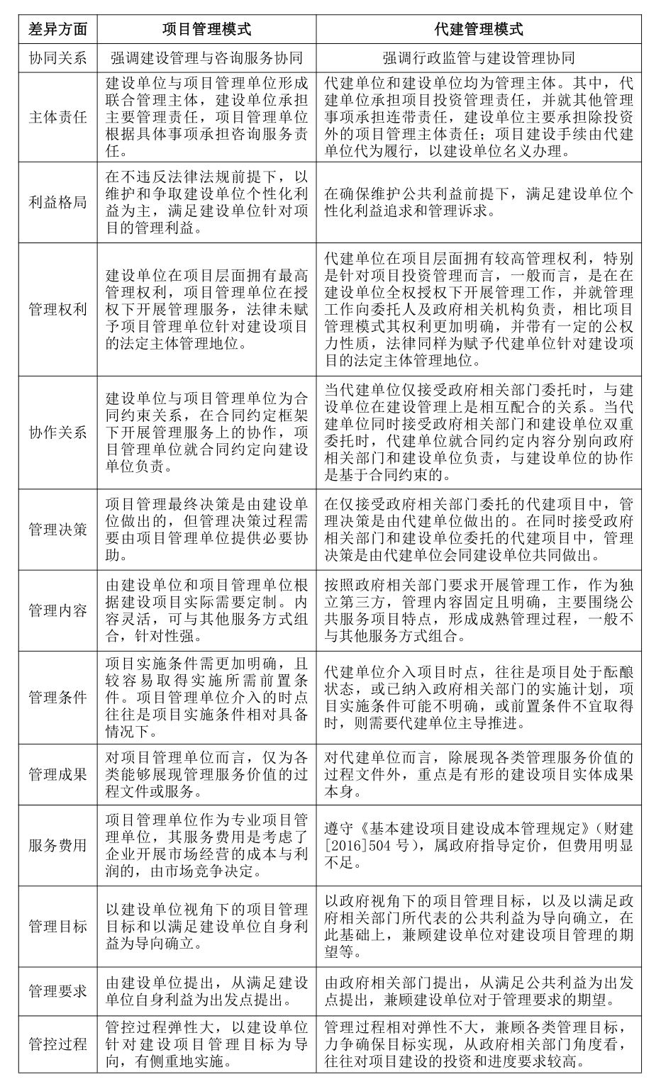表1:项目管理模式及代建管理模式主要差异一览