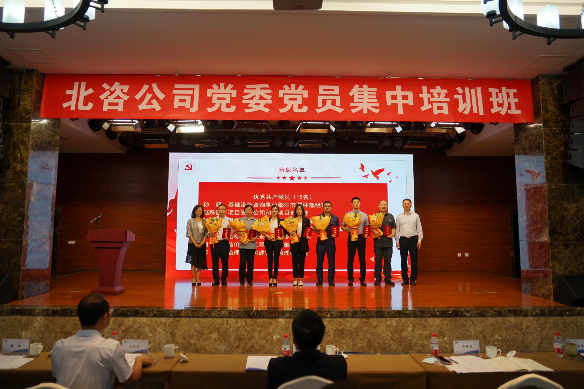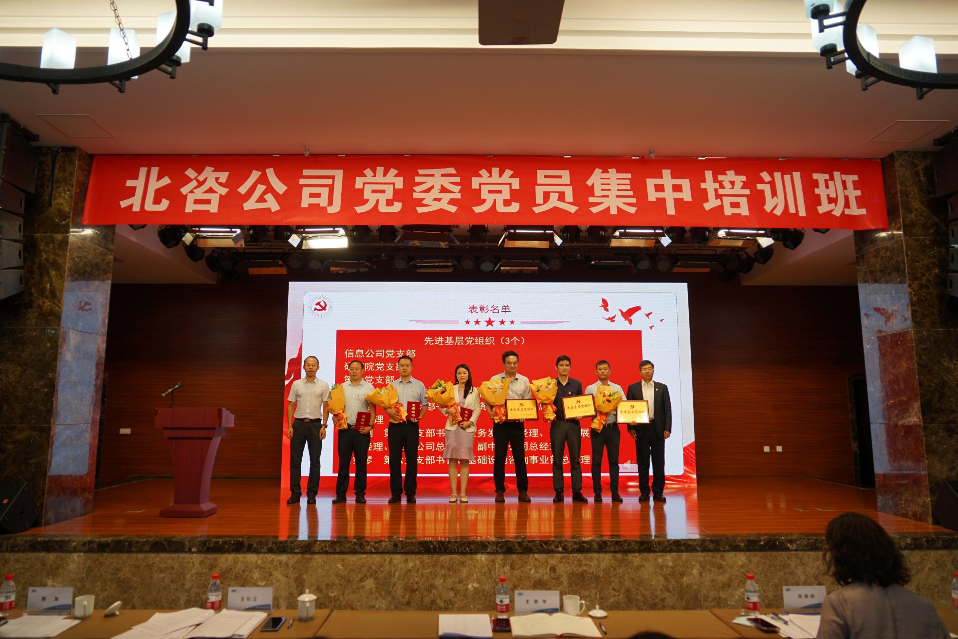 王长江宣读《中共北京市工程咨询有限公司委员会关于表彰优秀共产党员、先进基层党组织和优秀党务工作者的决定》。现场通过PPT形式展示他们的先进事迹和风采,充分体现出北咨公司先进代表所共有的“忠诚敬业、开拓创新、团结协作、担当奉献”精神特质。随后,公司领导分别为受到表彰的优秀共产党员、先进基层党组织和优秀党务工作者颁发荣誉证书和牌匾。