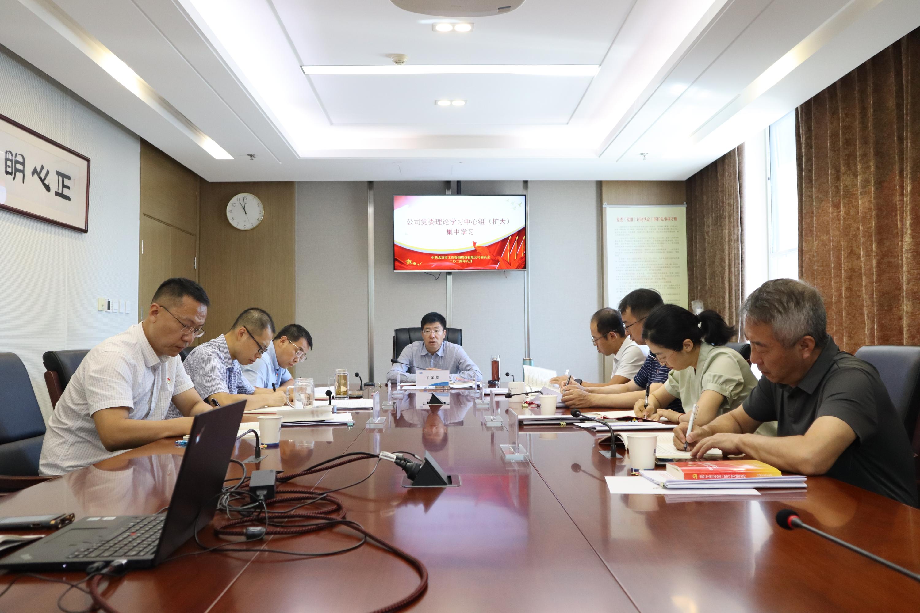 8月27日,公司党委召开理论学习中心组(扩大)集体学习会议,深入学习贯彻党的二十届三中全会精神,跟进学习习近平总书记近期重要讲话重要指示精神和中央重要会议精神,就北咨公司学习贯彻党的二十届三中全会精神、深化党纪学习教育作出部署。公司党委书记、董事长王革平主持会议并讲话,领导班子成员、各党务部门负责人参加学习。