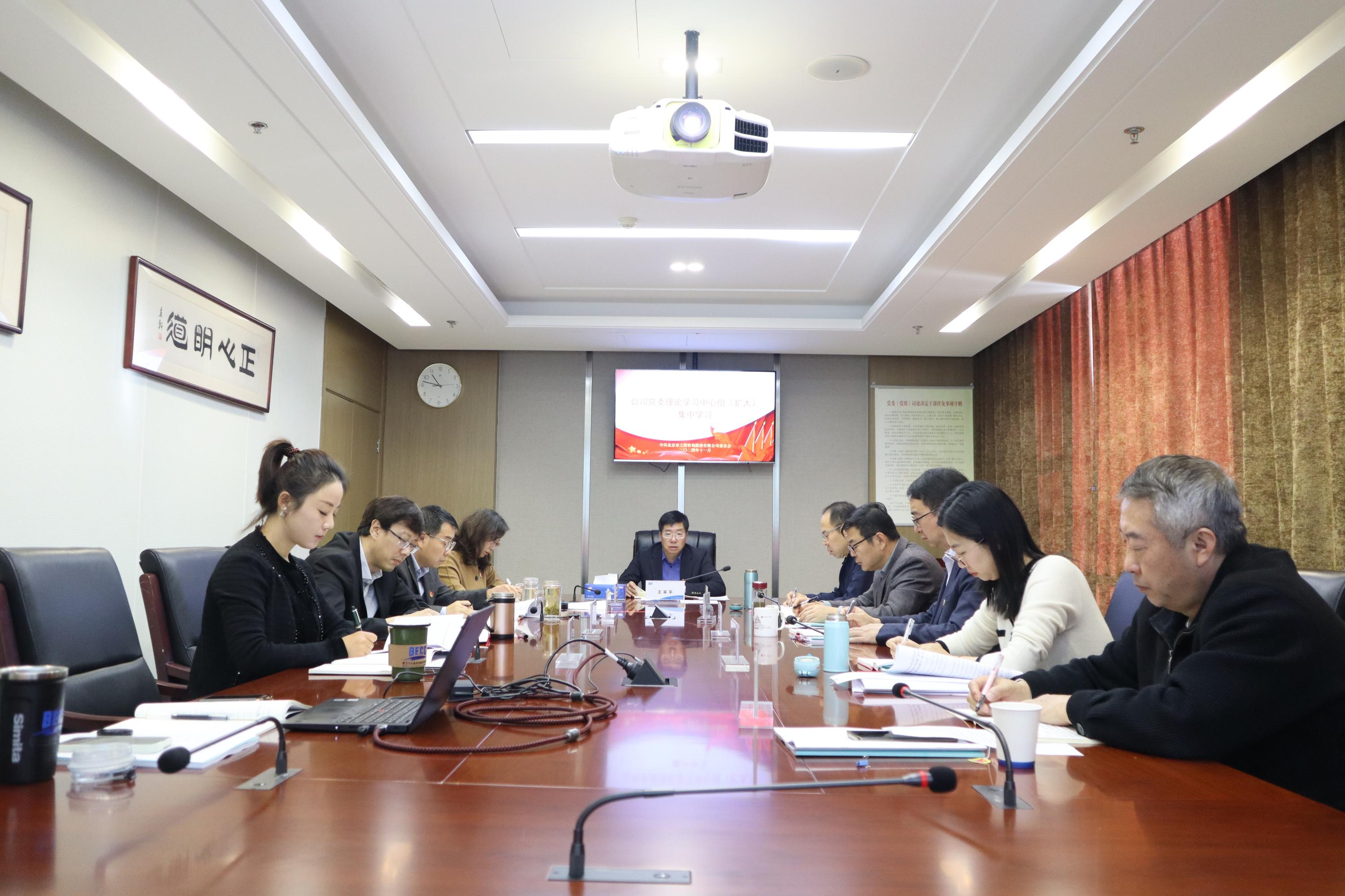 11月26日,北咨公司党委召开理论学习中心组(扩大)集体学习会议,认真传达学习习近平总书记近期重要讲话以及中央重要会议精神,并围绕党的二十届三中全会精神学习贯彻开展交流研讨。党委书记、董事长王革平主持会议并讲话,领导班子成员、各党务部门负责人参加学习。