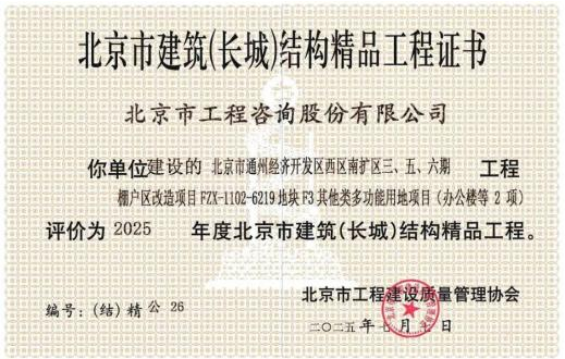 近日喜传捷报!北咨大厦项目凭借其卓越的建筑结构设计、精湛的施工工艺与过硬的工程质量,成功获评“2025年度北京市建筑(长城)结构精品工程”。这一荣誉是对项目建设质量的高度认可,也是对全体参建人员辛勤付出和项目管理成效的肯定,更是“项目管理+N”全过程工程咨询模式成功实践的里程碑标志,充分彰显了北咨公司在工程管理领域的专业实力。