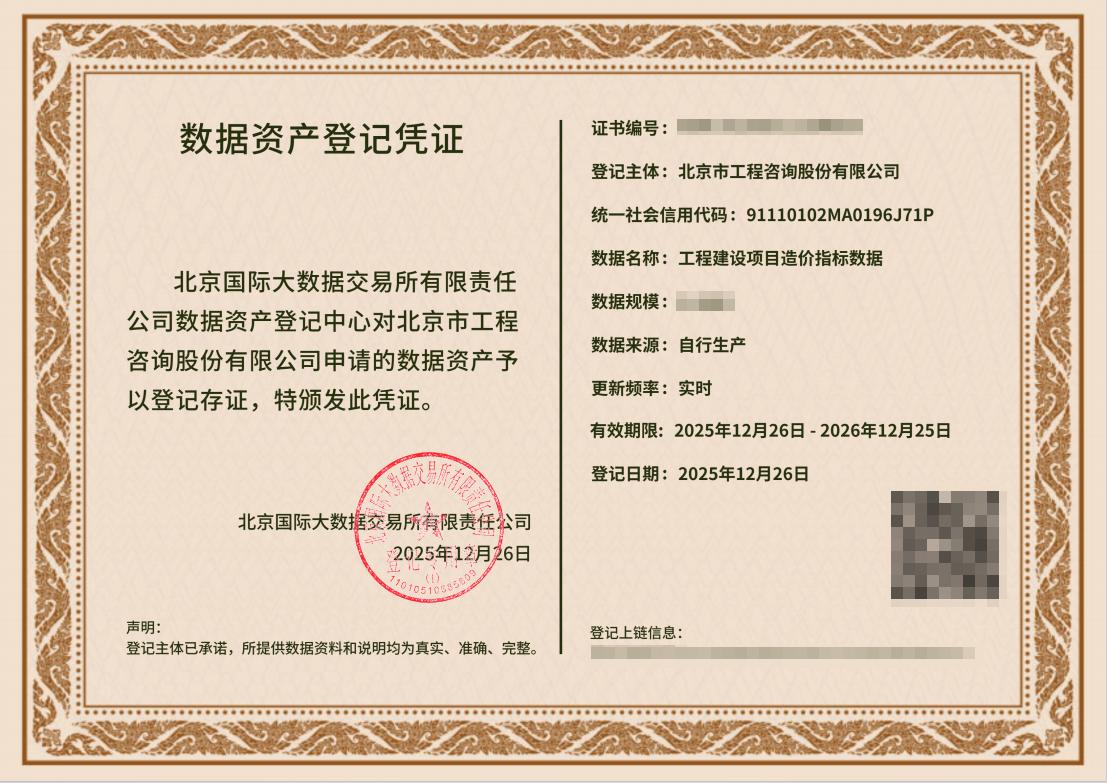 近日,北京国际大数据交易所有限责任公司数据资产登记中心对北咨公司申请的数据资产“工程建设项目造价指标数据”予以登记存证,并颁发数据资产登记凭证。公司后续将结合工程投资大数据平台项目实施进度,完成数据资产入表工作。