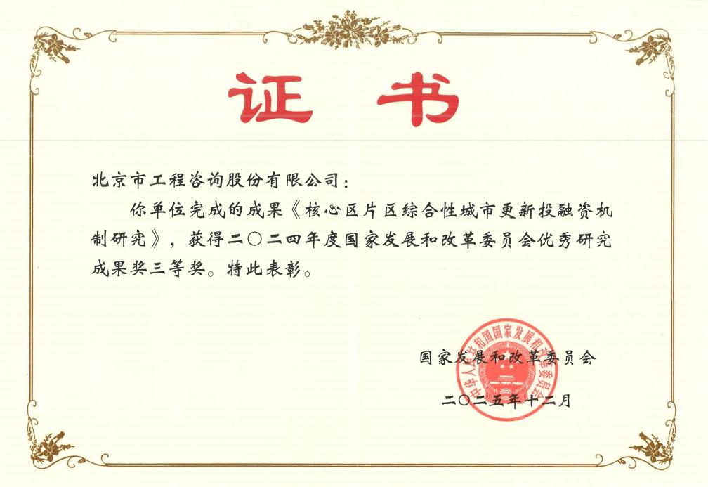 近日,国家发展和改革委员会公布了2024年度优秀研究成果获奖名单,北咨公司承担的《核心区片区综合性城市更新投融资机制研究》《支撑北京建设花园城市战略规划的重点问题、重大项目研究》两项研究成果,凭借扎实的研究内容与突出的实践价值,荣获优秀研究成果奖三等奖。