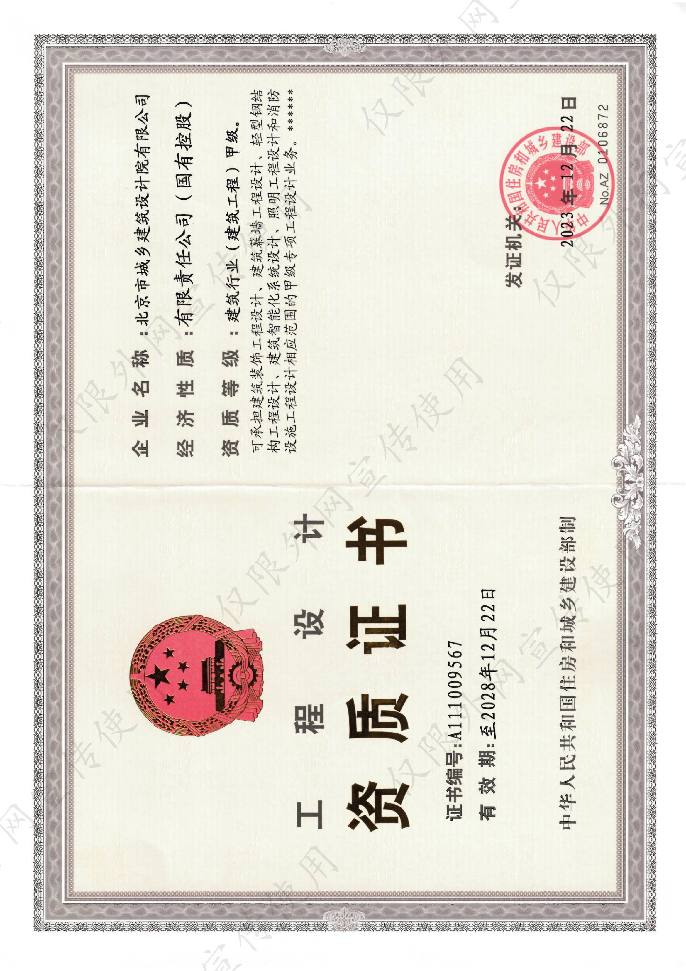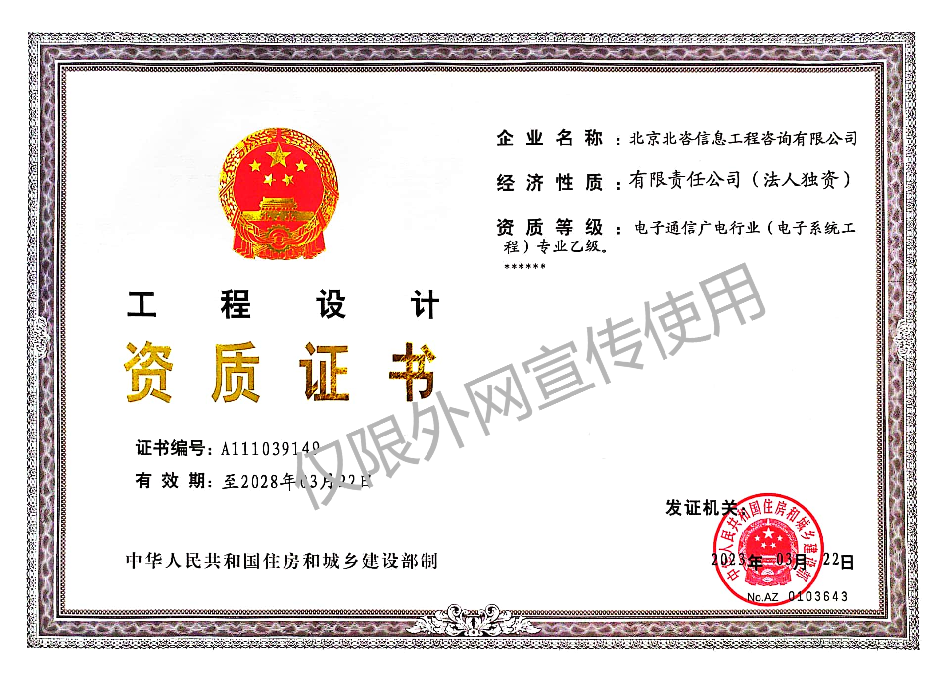 | 9 | 质量管理体系认证证书 | 10 | 工程设计资质证书-电子通信广电行业专业乙级 |