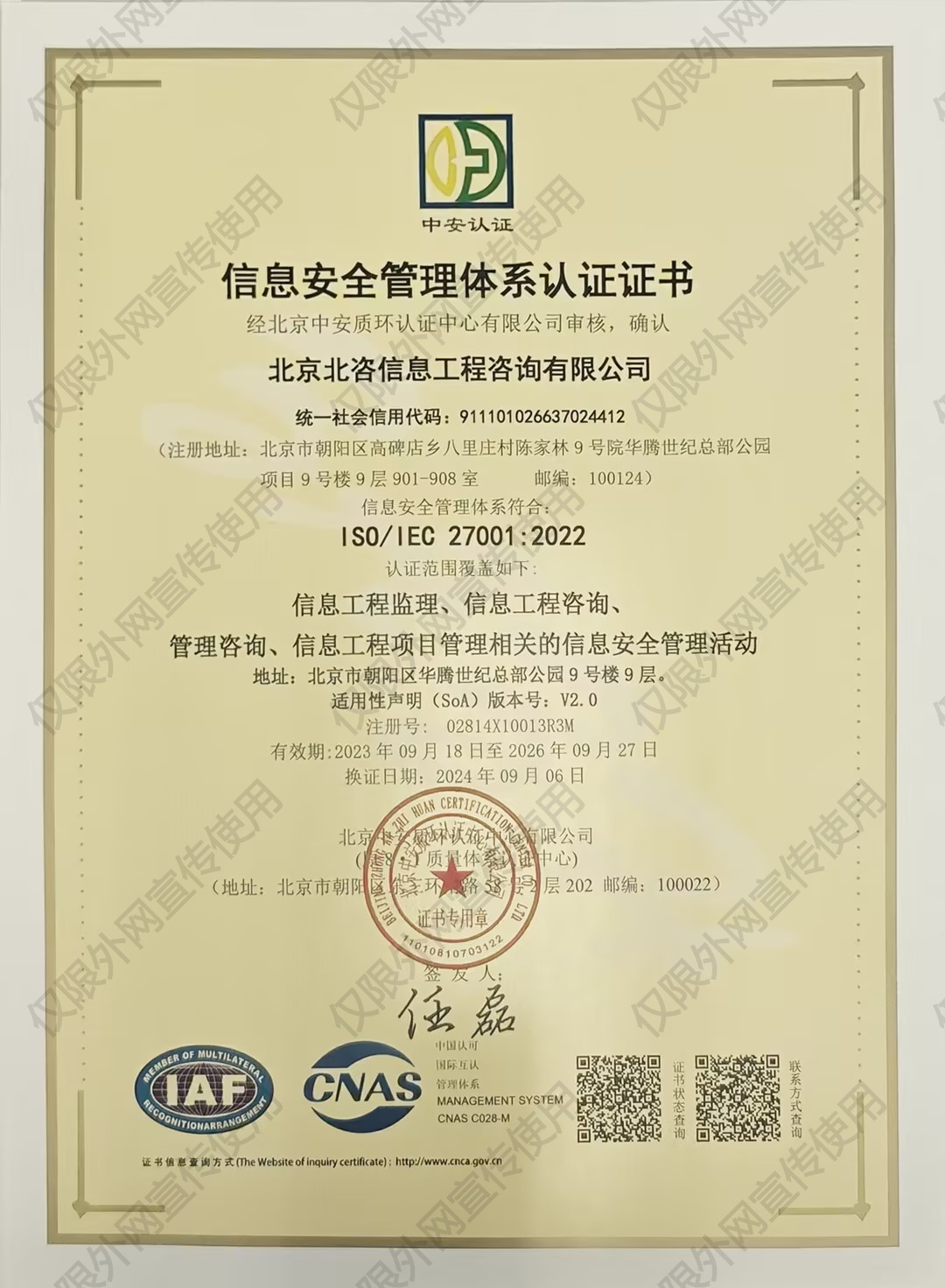 | 13 | 职业健康安全管理体系认证证书 | 14 | 信息系统工程监理服务标准贯标甲级单位 |