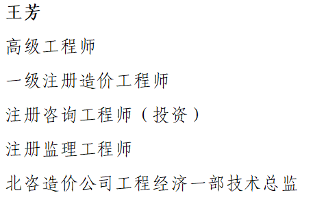 王芳现任北咨造价公司工程经济一部技术总监,自2005年以来一直在工程投资领域从事造价咨询工作,承担项目涉及轨道交通、市政厂站、交通枢纽、市郊铁路、综合管廊、水利水运、房屋建筑、道路交通、环境整治、景观园林和农业设施等多个专业,涵盖概算评审、决算审核、决算编制、价格测算、投资估算、清单编制、清单审核、全过程造价咨询和课题研究等业务。在公司工作的18年间,王芳共完成工程造价咨询数百项,项目投资数千亿元,为国家节约投资数百亿元。