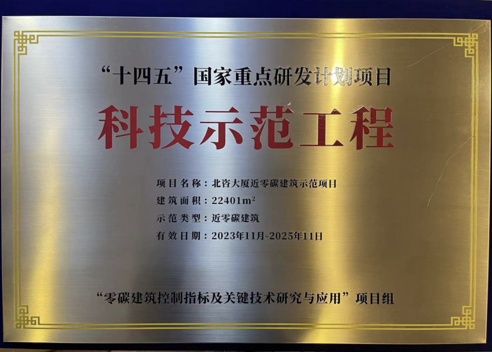 建筑领域的绿色低碳发展不仅是行业自身的需求和趋势,更是全球可持续发展战略的重要组成部分。北咨公司积极响应“十四五”时期建筑领域绿色低碳改造的目标,率先在北咨新总部实行先进绿色低碳应用技术,探索建设寒冷地区万平米以上兼具近零碳建筑、绿色三星建筑、近零能耗建筑,树立了行业示范。在2023年第十届全国近零能耗与零碳建筑大会上,北咨新总部项目获评“十四五”国家重点研发计划项目科技示范工程(示范类型为近零碳建筑),入选国家科技部“零碳建筑控制指标及关键技术研究与应用项目组”认可的首批零碳建筑目录。